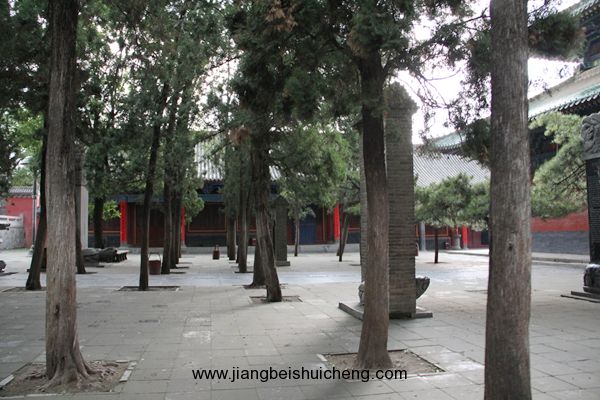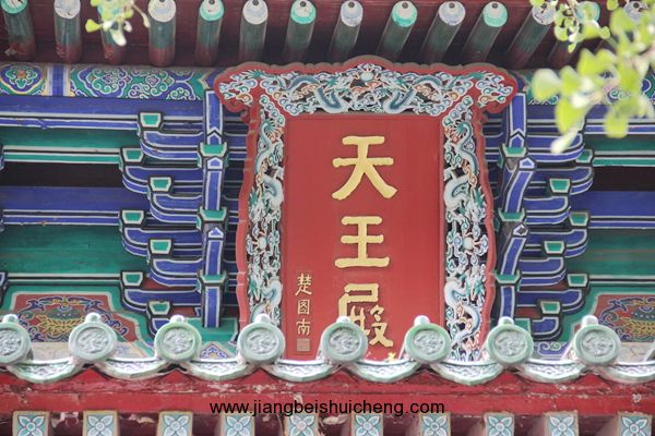 經(jīng)甬道過碑林后便是天王殿,三間重檐歇山頂?shù)钐?,外面有兩大金剛,?nèi)里則是四大天王像,威武雄壯。