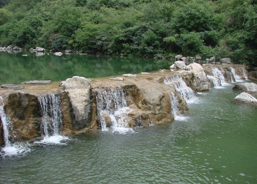 三、潭瀑峽地處云臺(tái)山北部略偏西,是主要河流子房河的一個(gè)源頭。溝長(zhǎng)2000米,南北走向。溝東面,峭壁聳翠,基巖裸體。溝西面,競(jìng)秀峰參差俏麗,峰群一字排列,峰峰直立,爭(zhēng)奇斗異。在曲曲彎彎的溝槽內(nèi),瀠洄著一條會(huì)唱歌、會(huì)跳舞的溪水。這條能歌善舞的溪水叫小龍溪。它的溪床,由一層層高低不一、色彩有別、寬窄不同、曲折有致、形態(tài)各異的自然山石臺(tái)階所組成。小龍溪?jiǎng)t像一隊(duì)美麗的歌舞明星,以層層臺(tái)階作舞臺(tái)載歌載舞,翩翩歷階而下。并在每個(gè)石階舞臺(tái)上,表演出精彩的節(jié)目,奉獻(xiàn)出妙不可言的美景?;虮滩ㄊ幯?,或?yàn)橄迹蚍炙镐讣?xì)流,或匯合湍湍激流,或傾瀉、或跌落成為銀光閃閃的瀑布,瀑下積水,成為彩潭。色澤悅目,清音悅耳。承蒙大自然造化的神奇,逆水而行,有如游仙,步步引人入勝,美景層出不窮,好戲連臺(tái),演奏出十二部美好的山水樂章。即:迎賓第一潭、九對(duì)情人、翡翠仙子、金潭銀瀑、丫字瀑潭、群芳競(jìng)秀、隋唐山寨、清漪仙池、水簾仙居、碧玉仙子、仙蹤劍影、龍鳳呈祥。
