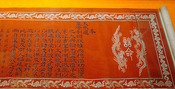 博物館館長(zhǎng)劉新華先生介紹,這處“圣旨”博物館為二層仿古建筑,展出面積1000多平方米,館藏明代、清代的詔書、國(guó)書、誥封、敕封(通稱為圣旨) 達(dá)132道之多,開館展出的“圣旨”55道,以及“偽滿洲國(guó)圣旨”和日本、越南、韓國(guó)等國(guó)家的“圣旨”,并配以明清時(shí)期的科舉試題、殿試卷、官場(chǎng)文書、字畫匾牌及用墨魚汁做墨汁密寫在衣衫內(nèi)的“夾帶小抄”等科舉文物2000多件,反映了當(dāng)時(shí)的政治、經(jīng)濟(jì)、軍事、外交及中國(guó)宮廷文化等多種形態(tài)。