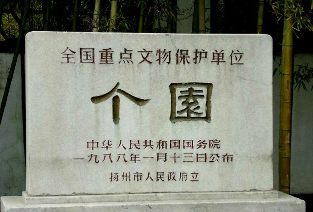 揚州有座私家園林,叫作個園,由兩淮鹽業(yè)商總黃至筠建于清嘉慶23年(公元1818年)。設(shè)計者將春、夏、秋、冬四季假山設(shè)置在一園之中,人們可以隨時感受四時美景,并周而復(fù)始,頗具“壺天自春”之意。這種獨特的藝術(shù)手法在我國傳統(tǒng)園林中是極為少見的。個園旨趣新穎,結(jié)構(gòu)嚴(yán)密,是中國園林的孤例,也是揚州最富盛名的園景之一。1988年被授予“全國重點文物保護(hù)單位”,位列中國四大名園之一。