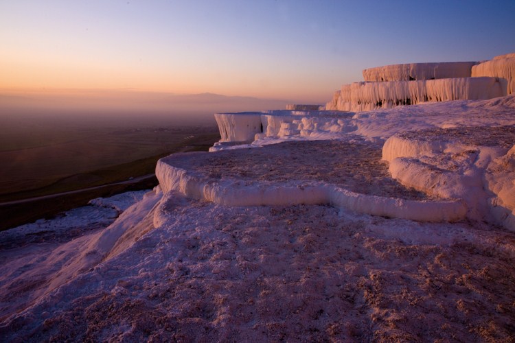 帕穆克卡萊又稱棉花堡,以其如棉花堆積而成的地貌而聞名于世。這里擁有土耳其最負(fù)盛名的溫泉,溫泉源自土耳其西安納托利亞的卡爾達(dá)吉山一側(cè),水溫37攝氏度,從地下汩汩冒出,經(jīng)過一系列“白色梯田”瀑布般流下。這些“白色梯田”均由泉水帶來的一種碳酸鈣白色物質(zhì)組成。在大約100階的“梯田”中,每一層都聚有水塘,泉水中含有的礦物質(zhì)為巖石表面涂上了令人驚奇的色彩和光澤。在棉花堡溫泉附近是建于公元前190年的赫拉波利斯城遺址。該城在古羅馬時(shí)代即是心臟病、皮膚病和風(fēng)濕病患者的一個(gè)著名礦泉療養(yǎng)地。
