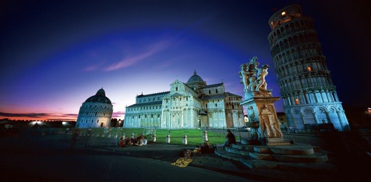 奇跡廣場(chǎng)又稱主教堂廣場(chǎng),位于意大利托斯卡納大區(qū)比薩市中心,廣場(chǎng)上有四大建筑: 主教堂、比薩斜塔(鐘樓)、圣喬凡尼洗禮堂、洗禮堂墓園,廣場(chǎng)周圍還保留著古代的城墻和城門,中間有大片的草地。奇跡廣場(chǎng)上始建于1063年的這組建筑深刻影響了從11世紀(jì)到1284年的建筑發(fā)展和14世紀(jì)的藝術(shù)發(fā)展,堪稱中世紀(jì)基督教建筑的典范。教堂大廳中的銅制吊燈被稱為“伽利略吊燈”,當(dāng)年19歲的伽利略在教堂內(nèi)觀察到吊燈的擺動(dòng),發(fā)現(xiàn)了小擺動(dòng)的等時(shí)性定律,這是他動(dòng)力學(xué)研究的序幕,在比薩斜塔頂?shù)?ldquo;兩個(gè)鐵球同時(shí)落地”的實(shí)驗(yàn)則使他得出了自由落體定律。圣喬凡尼洗禮堂則是意大利最大的洗禮堂。至于奇跡廣場(chǎng)的得名,則是來自于意大利作家鄧南遮1910年出版的一部小說中的句子“Ardea旋轉(zhuǎn)了基督的天空,旋轉(zhuǎn)了奇跡的草地。”