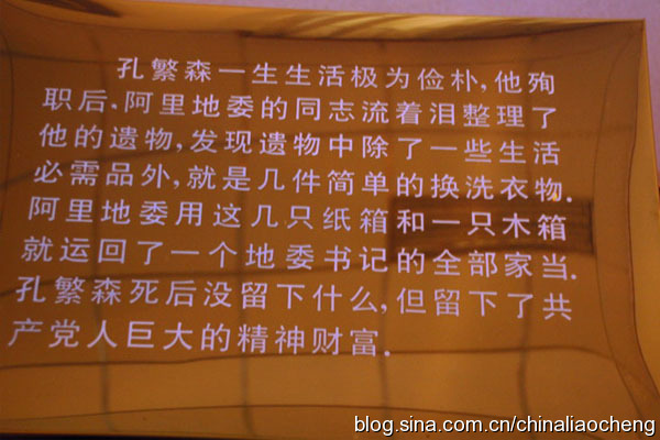 孔繁森的事跡催人淚下,激人奮進,報告會上,說起孔繁森,臺上、臺下都泣不成聲。這里存放著西藏自治區(qū)原副主席次仁卓嘎哈把孔繁森還未來得及領(lǐng)取的“全國民族團結(jié)進步先進個人”的獎?wù)?,轉(zhuǎn)交給他的妻子王慶芝時的感人情景的紀(jì)念照。