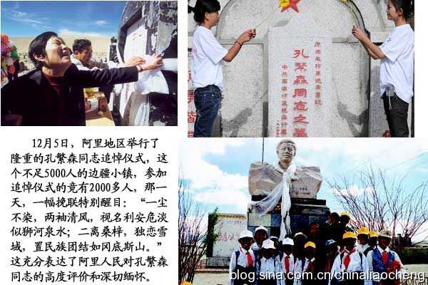 12月15日,阿里地區(qū)舉行了隆重的孔繁森同志追悼儀式,這個不足5000人的邊疆小鎮(zhèn),參加追悼儀式的竟有2000多人,那一天,一幅挽聯(lián)特別醒目:“一塵不染,兩袖清風(fēng),視名利安危淡似獅河泉水;二離桑梓,獨戀雪域,置民族團結(jié)如岡底斯山。”這充分表達了阿里人民對孔繁森同志的高度評價和深切緬懷。