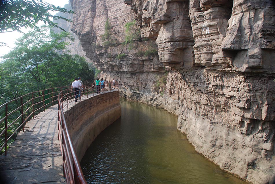 紅旗渠以濁漳河為源。渠首位于山西省平順縣石城鎮(zhèn)侯壁斷下??偢汕L70.6公里,渠底寬8米,渠墻高4.3米,縱坡為1/8000,設(shè)計加大流量23秒立方米,全部開鑿在峰巒迭嶂的太行山腰,工程艱險。