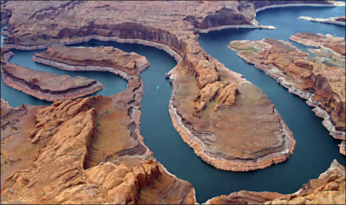鮑威爾(POWELL)湖是為紀念那位第一個漂流此河并建議開發(fā)水利的先驅(qū)而命名的。它的面積是米德湖的兩倍多,有各種紅色砂巖、石拱、峽谷和萬面碧波,其風(fēng)景遠勝米德湖,已成為美國西南部的主要國家度假區(qū)。