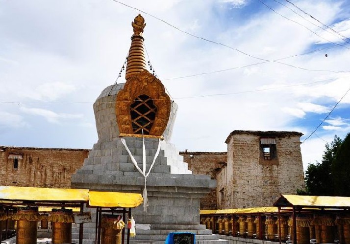 經(jīng)堂四壁遍繪壁畫,有釋迦牟尼傳記、六莊嚴(yán)(即龍樹、圣天、無著、世親、陳那和法稱)、密集金剛、西方有樂世界等題材。經(jīng)堂北側(cè)的羅漢殿(乃登拉康)供奉釋迦牟尼、十八羅漢和四大天王、馬頭金剛(為慈悲觀音的化身)、忿怒神(為佛在降魔除障時(shí)顯現(xiàn)的“法身”)等塑像。羅漢殿的東側(cè)是大威德殿(結(jié)幾拉康),主供大威德塑像(格魯派主修的護(hù)法神)。據(jù)說這尊神像是釋迦也失特請(qǐng)后藏雕塑家夏艾哇塑的。塑像腹是裝藏有熱羅扎哇的一個(gè)拇指,塑完后釋迦也失親自主持了開光誦經(jīng)儀式。大威德神像兩側(cè)共有吉祥天女、六臂依怙神、四臂依怙神、多聞天王、白梵天王等塑像。