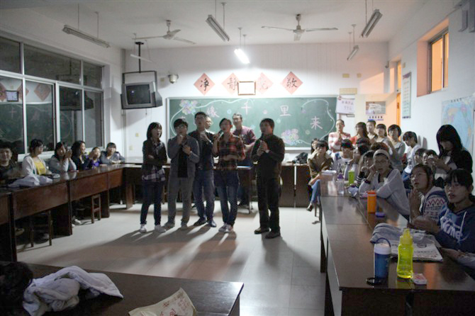 【網(wǎng)宣部】2012年10月12日晚,聊之旅旅行社運營總監(jiān)劉寶平參加聊城職業(yè)技術(shù)學(xué)院旅游管理學(xué)院2012級旅游管理班“有緣千里來相會”主題文藝晚會,劉老師與同學(xué)們一起歌唱,贏得了同學(xué)們的一陣陣掌聲。