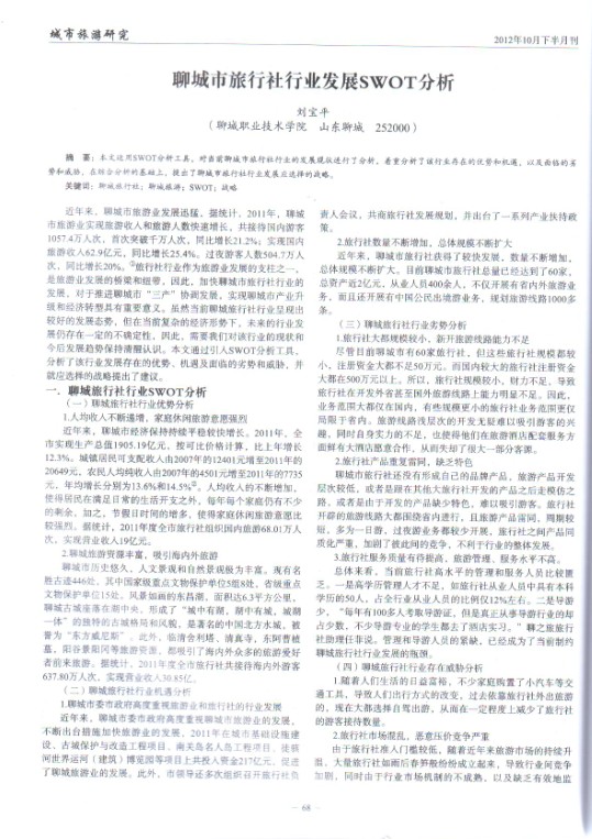 劉寶平在國家級期刊《旅游縱覽》發(fā)表文章《聊城市旅行社行業(yè)發(fā)展SWOT分析》