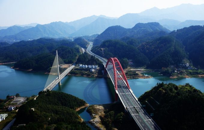 太平湖上,因為G205國道和G3京臺高速跨湖的需要修建了2座大橋,位于G205國道上的為斜拉索大橋,而G3高速上大橋為中承提籃結(jié)構(gòu)。