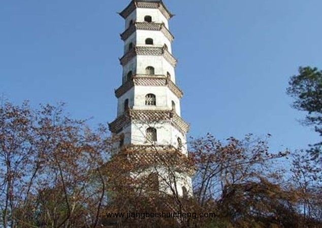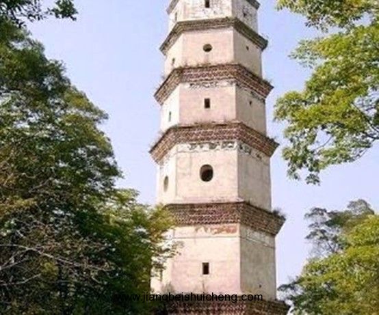 塔平面六邊形,底邊長3.9米,七層樓閣式磚塔,通高36米,塔身疊澀出檐。底層以及三至七層正面各開券頂門,二層各面相間開長方形、圓形窗,其余各層相間、上下相錯開5個方形窗。塔頂六角攢尖。塔內(nèi)各層設(shè)木樓板和木樓梯。門額有阮元題刻的“秀發(fā)梧江”、“觀文成化”、“光射牛斗”等石匾。1982年維修,改木樓梯為鐵樓梯。