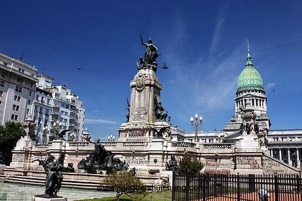 大廈前屹立著氣勢(shì)宏偉,造型別致精美的兩會(huì)紀(jì)念碑。紀(jì)念碑底座是一個(gè)寬闊的花崗巖平臺(tái),四個(gè)角上雄踞著展翅欲飛的銅塑雄鷹,紀(jì)念碑頂上站立著一尊代表共和國(guó)的婦女銅像,她右手持象征勝利的月桂枝,左手扶犁代表勞動(dòng),腳下踏著一條毒蛇,表示懲戒邪惡。版權(quán)所有山東聊城聊之旅國(guó)際旅行社有限公司,轉(zhuǎn)載必究!紀(jì)念碑的中部?jī)蓚?cè),各有一個(gè)婦女雕像,一個(gè)高舉掙斷了的鐵鏈,象征1813年大會(huì),另一手拿國(guó)旗、國(guó)徽,象征1816年議會(huì)。緊靠紀(jì)念碑底座前邊有一座音樂(lè)噴泉?;◢弾r的水池周?chē)?,有一組生動(dòng)的銅雕。一個(gè)男青年腰圍飄逸的布裙,象征著奔流的拉普拉塔河水,他身邊兩位捧罐倒水的婦女則代表拉普拉塔河的兩個(gè)支流,在他們前面有四匹駿馬好似從水中騰躍而起,馬口也是噴泉的出水口,此外還有造型逼真的蜥蜴、水蛇等拉普拉塔河流域的動(dòng)物。音樂(lè)聲起,水柱騰空,隨著節(jié)拍搖弋起舞。夜晚配以變幻的燈光,場(chǎng)面更加迷人。