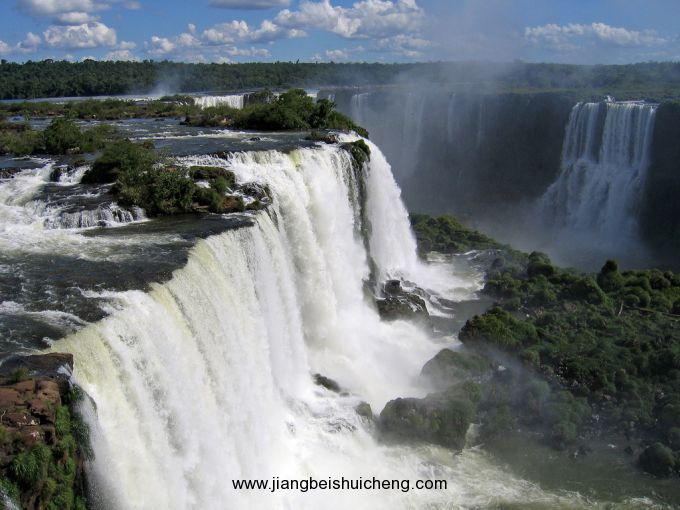 伊瓜蘇大瀑布,亦作Iguassu或Iguazu,西班牙語(yǔ)作Cataratas del Iguazu,葡萄牙語(yǔ)作Cataratas do Igua?u或Saltos do Igua?u,平均流量1,751立方米/秒,為馬蹄形瀑布,高82米(269呎),寬4公里(2.5哩),是北美洲尼加拉瀑布寬度的4倍,比非洲的維多利亞瀑布大一些。懸崖邊有無(wú)數(shù)樹(shù)木叢生的巖石島嶼,使伊瓜蘇河由此跌落時(shí)約分為275股急流或?yàn)a瀑,高度60~82米(200~269呎)不等。該瀑布與伊瓜蘇河皆得名于一個(gè)意為「大水」的瓜拉尼語(yǔ)(Guarani) 詞匯。流入伊瓜蘇河。