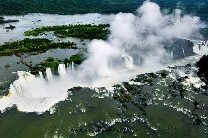“伊瓜蘇”在南美洲土著居民瓜拉尼人的語(yǔ)言中,是“大水”的意思。發(fā)源于巴西境內(nèi)的伊瓜蘇河在匯入巴拉那河之前,水流漸緩,在阿根廷與巴西邊境,河寬1500米,像一個(gè)湖泊。水往前流陡然遇到一個(gè)峽谷,河水順著倒U形峽谷的頂部和兩邊向下直瀉,凸出的巖石將奔騰而下的河水切割成大大小小270多個(gè)瀑布,形成一個(gè)景象壯觀的半環(huán)形瀑布群,總寬度3000米至4000米,平均落差80米。