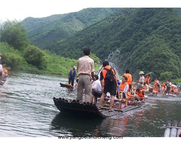 “江南第一漂”位于徽水河流經(jīng)涇縣的最后一段,上起烏溪鄉(xiāng)姚村,下止黃村鄉(xiāng),景區(qū)全長約20公里。景區(qū)內(nèi)河道蜿蜒曲折,水流湍急,兩岸層巒疊翠風(fēng)光綺麗,是休閑旅游的好去處。徽水河漂流途經(jīng)五大景區(qū):起筏地叫龍?zhí)?,灘長浪急,游人在竹筏上隨浪俯仰,跌宕穿梭,一種戰(zhàn)勝大自然的酣暢淋漓之感油然而生。接下來是“早霧山”景區(qū)。這里終日云霧繚繞,而水平浪穩(wěn),版權(quán)所有,山東聊城聊之旅國際旅行社有限公司,轉(zhuǎn)載必究!使游人跌宕之心轉(zhuǎn)而為柔情愜意。早霧山下端河道突轉(zhuǎn)急彎,形成“刁潭”,岸邊巨石上的“潭古印”,版權(quán)所有,山東聊城聊之旅國際旅行有限公司轉(zhuǎn)載必究!形象地記錄了昔日放筏工艱難的歲月。這里不知有多少放筏工誤落水中,而落水者卻浮而不沉,因而留下了“刁潭不刁”的神奇?zhèn)髡f。而“胡老灣沖浪”則更是一彎三折,灘中有垅、垅中有灘,千余米的河道落花流水差一米多,游人最能體現(xiàn)“兩岸猿聲啼不住,輕舟已過萬重山”的古詩意境。急灘甫過,柳暗花明又一村——溪西山到了,這里山高水秀,常有云霧繚繞,村舍依山俯傍水而筑,是道地的農(nóng)家風(fēng)光。沿流停筏,小扣柴扉,你能喝到頂級的綠茶“溪西山毛峰”。接下來便到了五雀嶺景區(qū),這里有雞公石、馬影石、木魚墩、百畝草坪、高灘晚釣、斷橋綠水等景點,人稱“江南小漓江”。