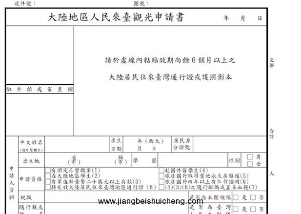 4)填寫完整的《北京市居民往來(lái)臺(tái)灣地區(qū)申請(qǐng)表》(出入境管理處提供)