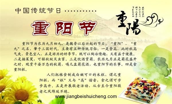 重陽(yáng)節(jié),又稱“踏秋”,每年農(nóng)歷九月初九日,為中國(guó)傳統(tǒng)四大祭祖的節(jié)日 。重陽(yáng)節(jié)早在戰(zhàn)國(guó)時(shí)期就已經(jīng)形成,到了唐代,重陽(yáng)被正式定為民間的節(jié)日,此后歷朝歷代沿襲至今。重陽(yáng)與三月初三日“踏春”皆是家族傾室而出,重陽(yáng)這天所有親人都要一起登高“避災(zāi)”,插茱萸、賞菊花。