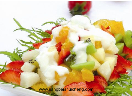 用酸奶代替沙拉醬做成了酸奶沙拉,不僅少去了沙拉醬的油脂,而且比沙拉醬更有營養(yǎng),而且草莓口味的,口感也更清爽。