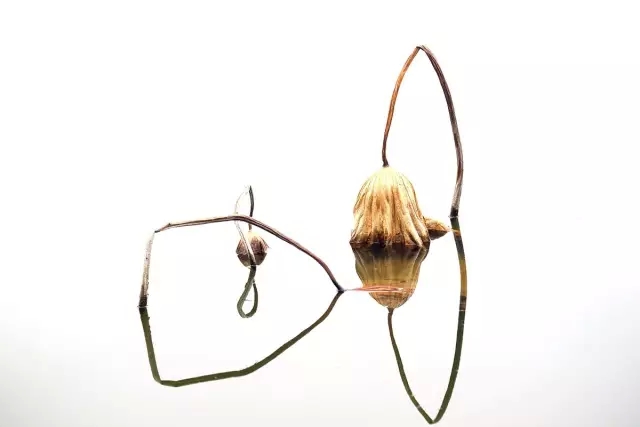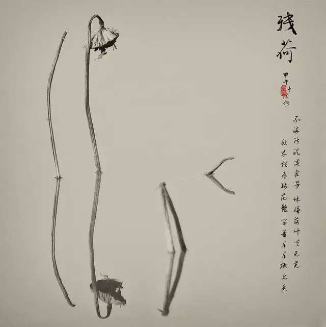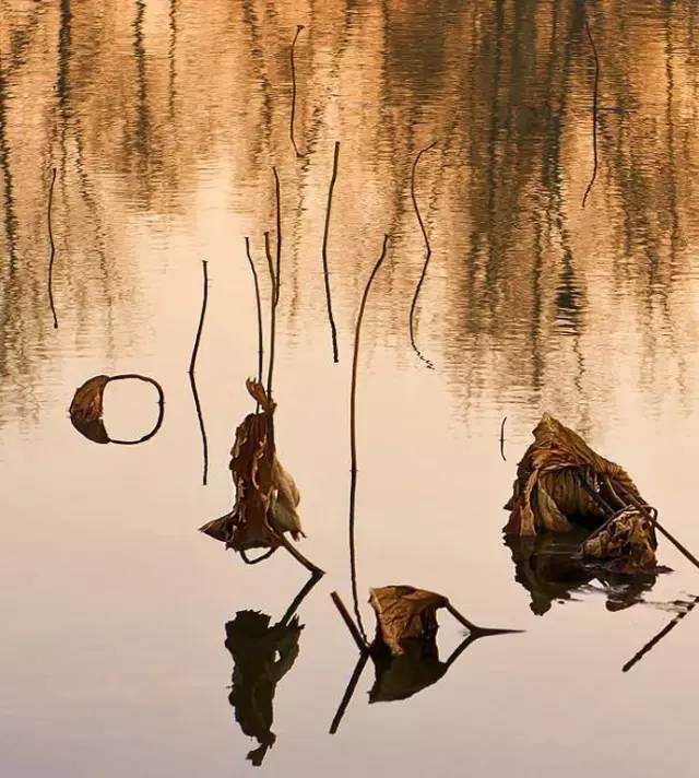 利用水中倒影來(lái)表現(xiàn)殘荷,使其增添一份凄清真實(shí)中帶著虛幻的味道。
