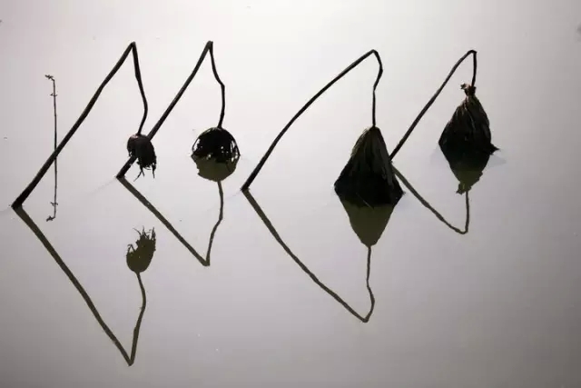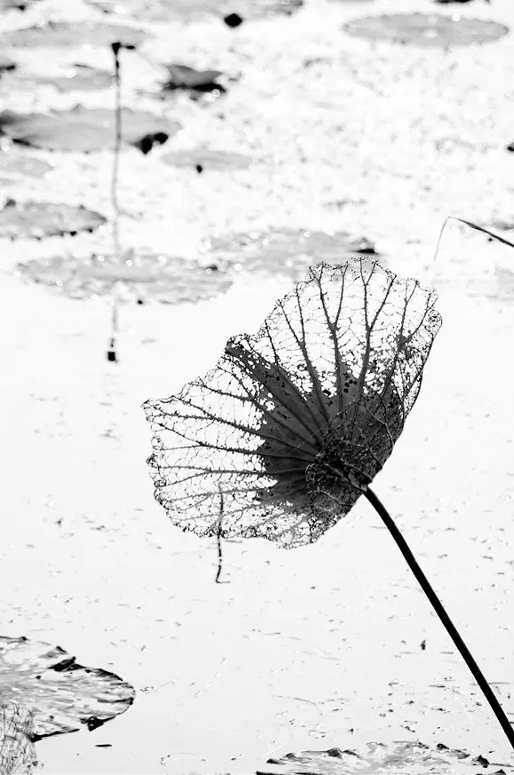 在色彩上也可以做減法,只留下黑白對(duì)比。去除了多余色彩的干擾,凸顯殘荷的形狀線(xiàn)條,更有了中國(guó)水墨畫(huà)的韻味。