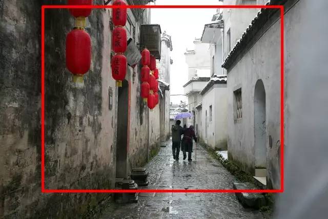 點(diǎn)評(píng):濕漉漉的青石板路,巷子邊上的引導(dǎo)線把觀眾的視線引到畫面中心的兩人身上,大紅燈籠更是點(diǎn)綴了整幅作品的基調(diào)。只是右側(cè)白墻的虛影擾亂視線,可剪裁掉,使畫面中心更突出。