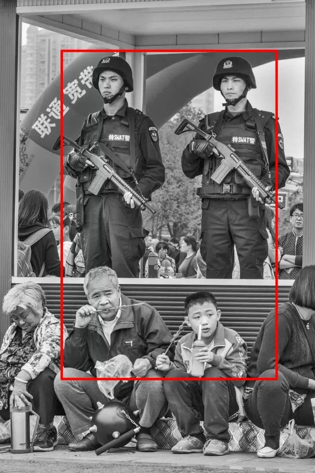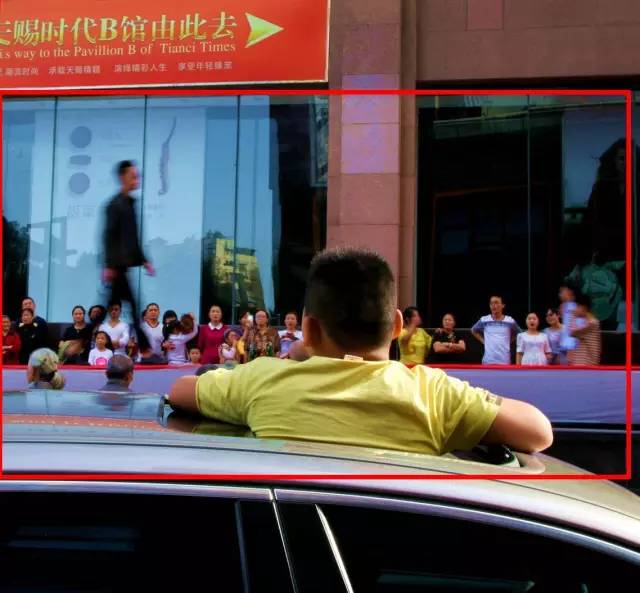 點(diǎn)評(píng):T臺(tái)表演者的虛化,靜止清晰的男孩,慢速拍攝能更好地表現(xiàn)虛實(shí)、動(dòng)靜的對(duì)比。但是,作者采取正方形的構(gòu)圖不妥,左上角的紅色廣告牌有些搶戲,下部的車窗影響視線。剪裁后,畫面更簡(jiǎn)潔明了。