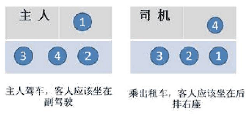 小轎車1號座位在司機的右后邊,2號座位在司機的正后邊,3號座位在司機的旁邊。(如果后排乘坐三人,則3號座位在后排的中間)。
