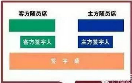 一般簽字桌橫放。簽字者面門而坐,賓右主左。參加者列隊站在簽字者之后。中央高于兩側(cè),右側(cè)高于左側(cè)。
