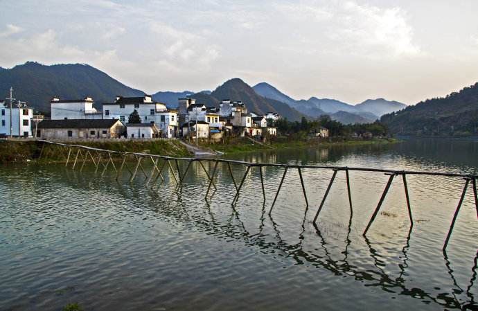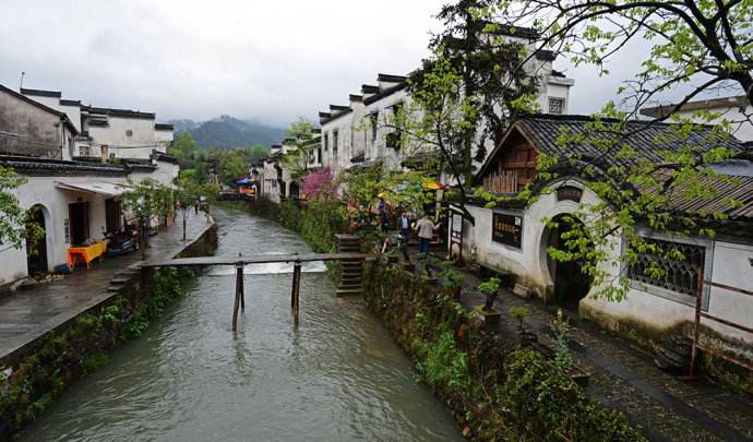 房屋間有街巷相通,岑河、許河、石河三水臺(tái)一的查濟(jì)河逶迤穿村而流,石渠繞每家每戶而過(guò);查濟(jì)河因落差較大,清澈的河水迭瀑式地流淌,沿河錯(cuò)落有致地建有多道拱石橋、板石橋、洞石橋,將兩岸民居相連。飽經(jīng)滄桑的石橋,藤蘿纏繞,遠(yuǎn)望猶如碧玉橫架水上,與兩岸青磚黑瓦遙相呼應(yīng)。