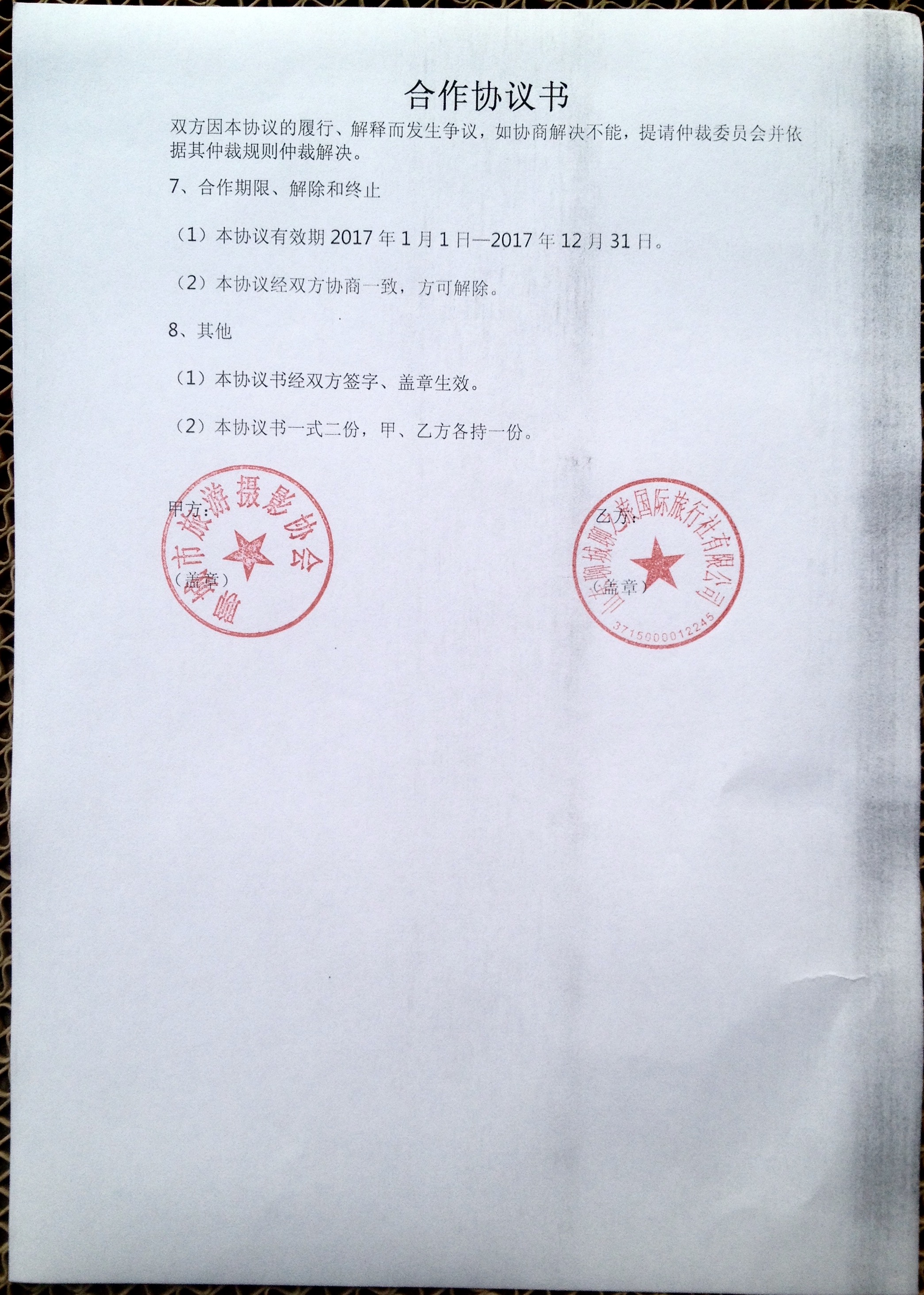為響應(yīng)國(guó)家政策號(hào)召,聊城市旅游攝影協(xié)會(huì)委托山東聊城聊之旅國(guó)際旅行社有限公司代理采風(fēng)活動(dòng)事宜,雙方經(jīng)過友好協(xié)商,本著互惠互利、優(yōu)勢(shì)互補(bǔ)的合作原則,達(dá)成以下協(xié)議。