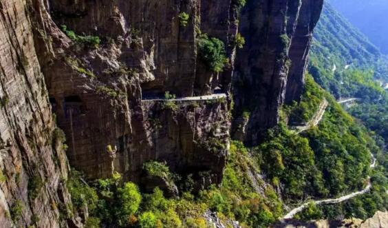 井底村著名的掛壁公路,全長(zhǎng)1500多米長(zhǎng)的“掛壁公路”, 39個(gè)窗口。是井底村人歷經(jīng)14年的時(shí)間,在懸崖峭壁上艱難地開鑿而成的。