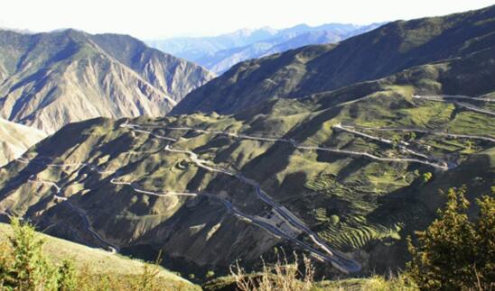 72道拐】,車在公路上以之字形盤(pán)旋曲折前進(jìn),進(jìn)入川藏公路拐彎最多的路段。下行到