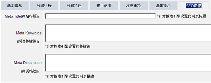 (2)(網(wǎng)頁關(guān)鍵詞):針對搜索引擎設(shè)置的關(guān)鍵詞 填寫線路內(nèi)包含的景區(qū)景點名稱,以及涉及到的地名?。ㄈ纾褐?、國家、省份、市、區(qū)、縣等地名)