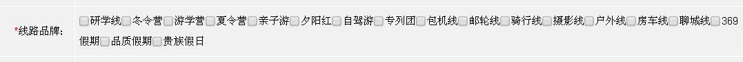 (3)線路品牌:可多選。 (線路品牌有嚴(yán)格的限制,比如攝影和戶外線,這個是需要專業(yè)領(lǐng)隊帶隊的,再,包機(jī)線路,必須是包機(jī)線路才可以,不是所有的飛機(jī)團(tuán)都是包機(jī);線路必須定位準(zhǔn)確,客戶才能最短時間找到哦。這個選項不是必選的,常規(guī)的行程可以選擇后面三個 369假期,品質(zhì)假期,貴族假日 其中一個 分別代表公司產(chǎn)品低端 中端 高端 的分類)