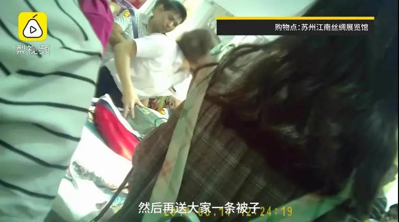 在購物點蘇州江南絲綢展覽館內(nèi),導(dǎo)購以低價和送被子活動吸引游客購買商品。