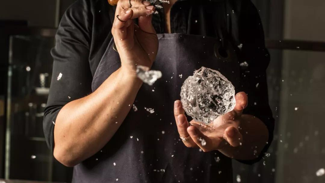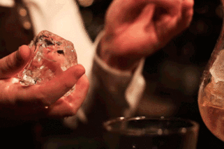 領(lǐng)悟到冰所攜帶的力量后,日本調(diào)酒師們很早便開始專研冰的藝術(shù)。所謂強(qiáng)將手下無弱“冰”,日本調(diào)酒師的手鑿冰球(Hand-carved ice balls)便是調(diào)酒界中的公認(rèn)精“冰”。他們會使用一些特殊器具,比如冰刀、冰鋸,來操練手中的冰塊。通常,他們先把一大塊巨冰切成小份,然后手拿“冰叉”鑿啊鑿,直到把冰塊鑿成球狀。聽起來很容易是嗎?但其實(shí),無任何保暖措施的手會被凍到毫無知覺,一個小小的失誤便會招來一趟醫(yī)院旅行。