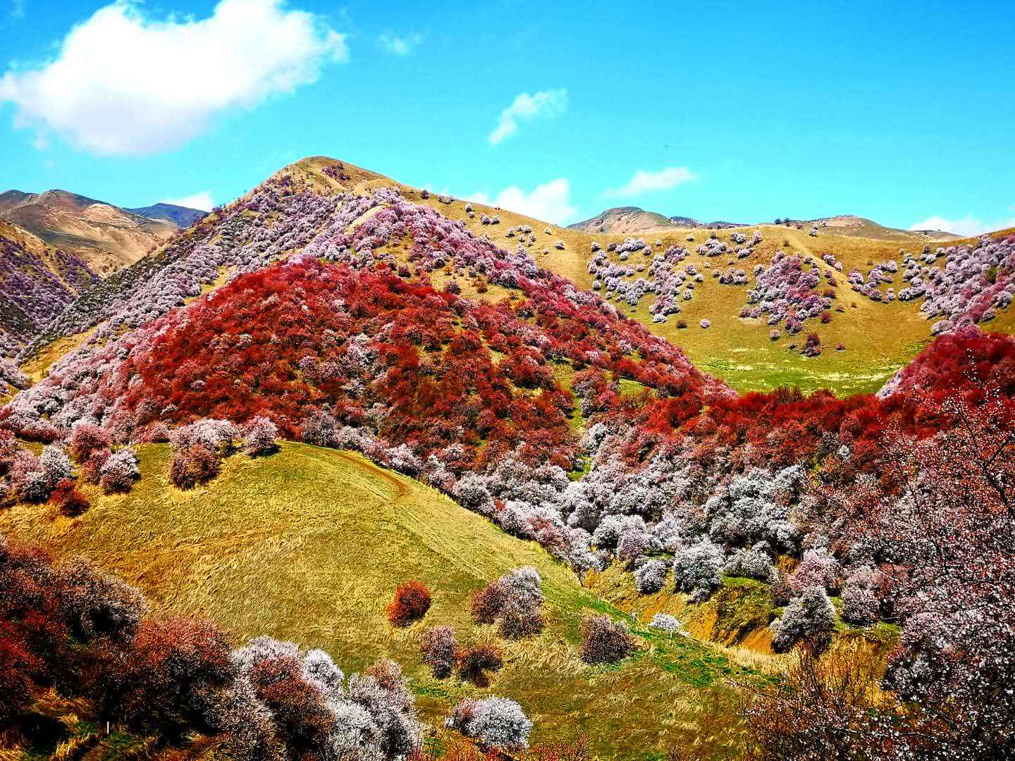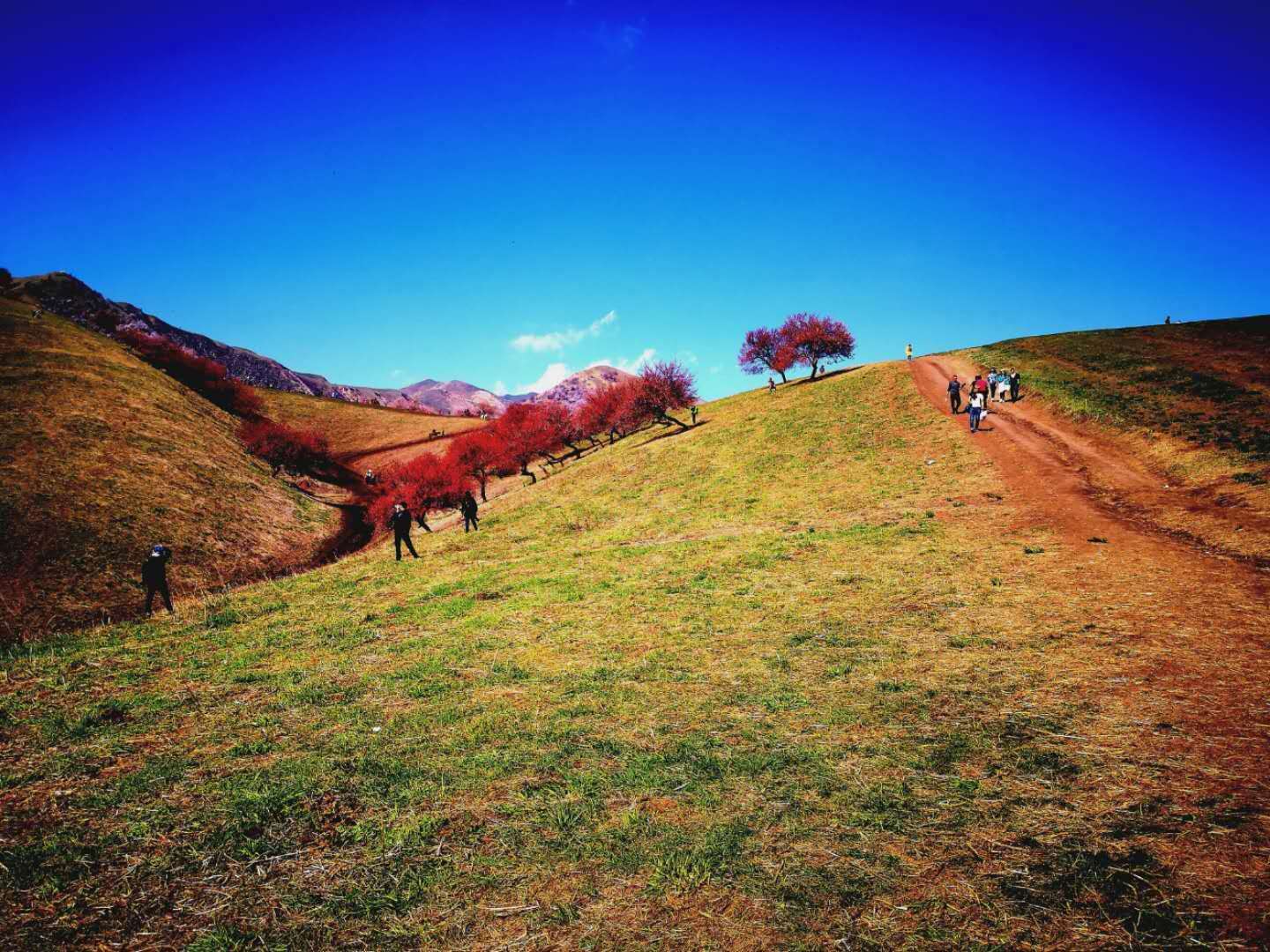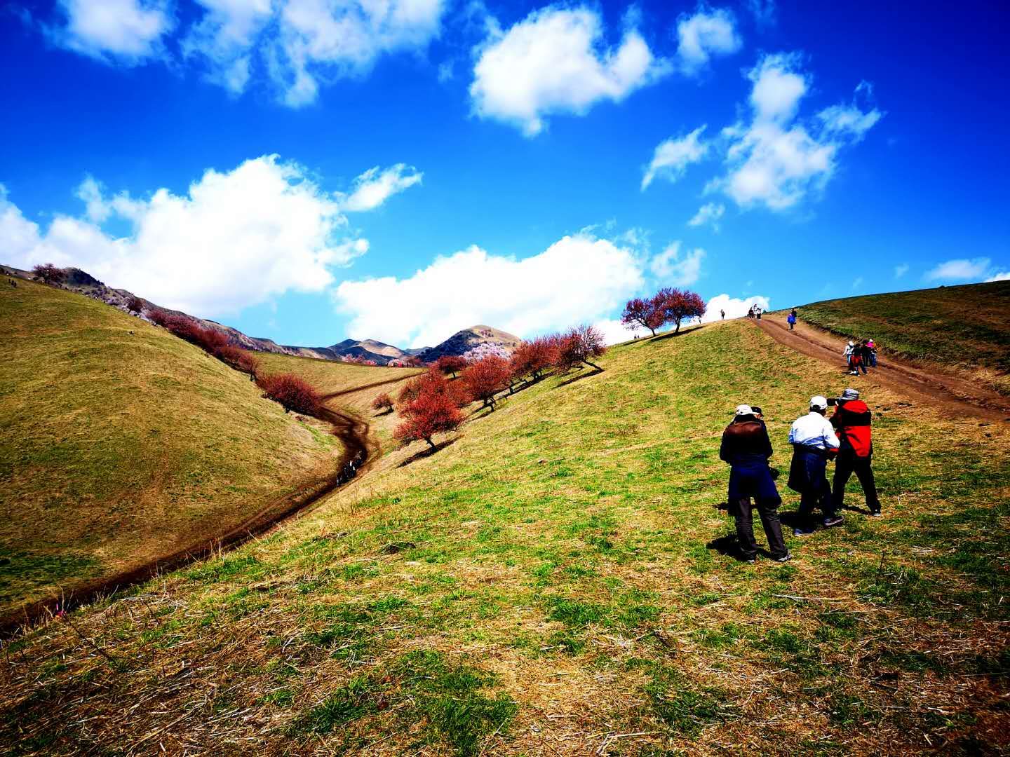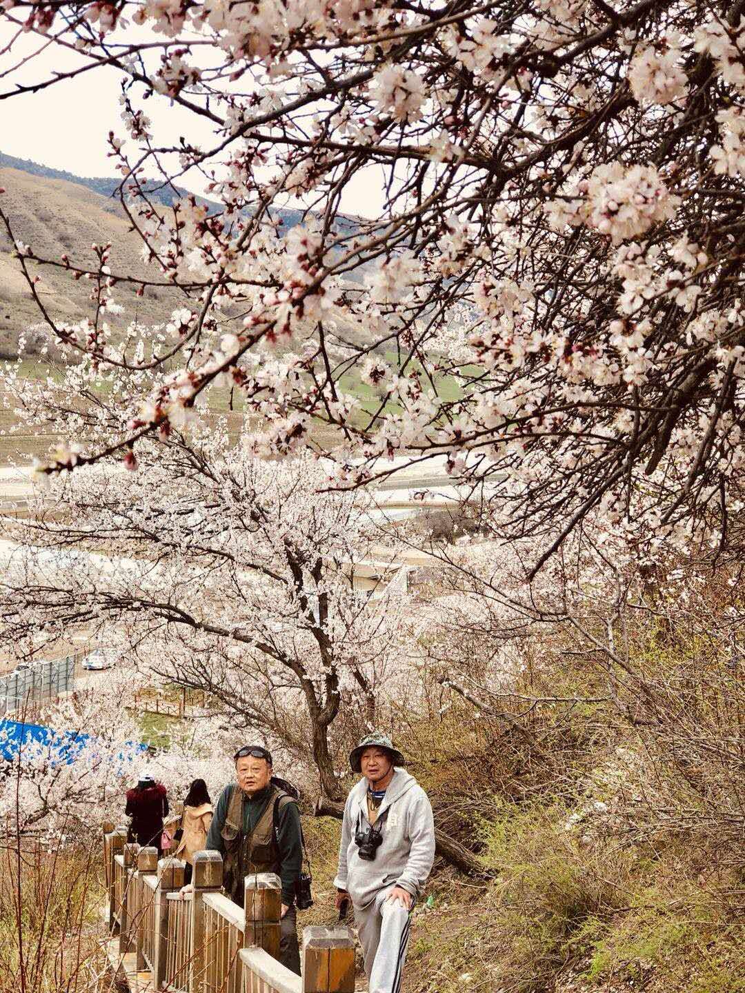 這沿途的杏花溝風(fēng)景已經(jīng)美不勝收了。北山坡在初綠的背景下,被鮮嫩的、淡淡的粉色所渲染,有大氣磅礴的場面。牧笛聲聲里的杏花村。