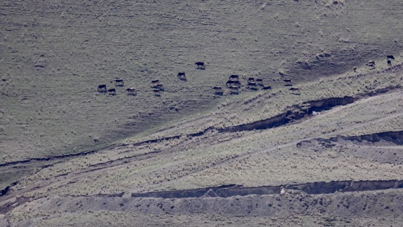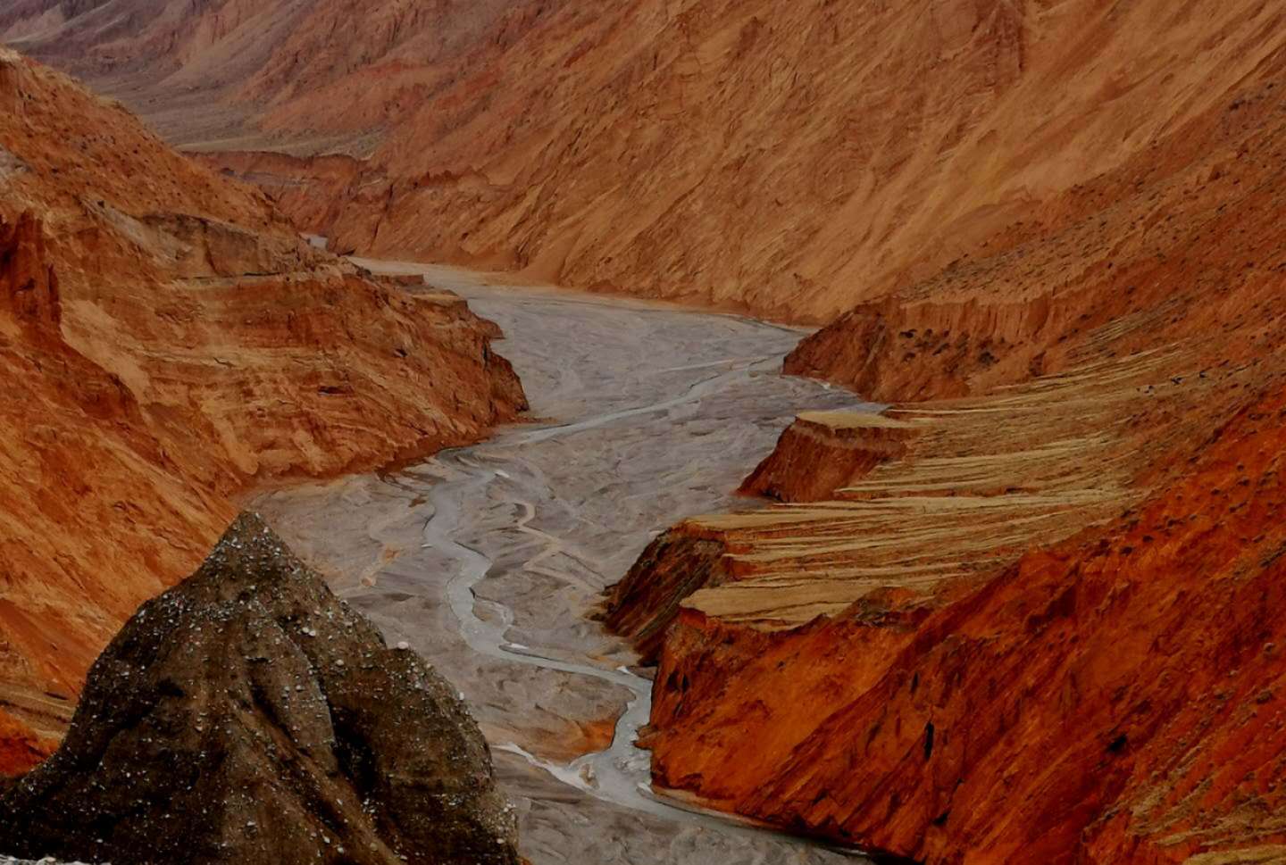 這是一個多彩的峽谷,河水是黃色的,一段峽谷的顏色是灰色的,遠處藍天白云下,連綿的雪山,近處是綠色的草甸。另一段峽谷的顏色是大片的紅色,如赤紅的丹霞,這應(yīng)該是紅山大峽谷名字的來歷吧。