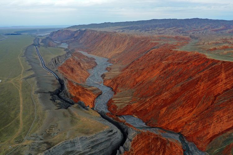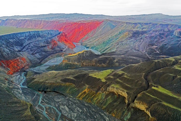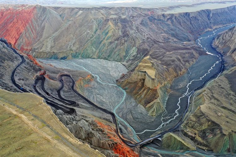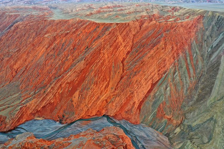 紅山大峽谷,位于新疆奎屯市安集海河流域,也稱安集海大峽谷。是兵團(tuán)農(nóng)七師紅山煤礦所在地。峽谷最深處約400米??v橫交錯(cuò)的溝壑,從峽谷邊緣一直延伸至谷底,形成險(xiǎn)峻的“山峰”?!吧椒濉本缮笆湍嗤两M成,高則百米,猶如一把把利劍,“鋒芒”直指蒼穹。大峽谷以其險(xiǎn)、奇而著稱,刀削斧劈的崖壁,蜿蜒曲折的流水,氣勢(shì)磅礴的深谷,色彩斑斕的奇石,以及象小甲蟲似的運(yùn)煤卡車從谷底緩慢盤轉(zhuǎn)在陡峭彎曲小道上,象一個(gè)個(gè)跳動(dòng)的音符,無不給幽深的峽谷增加了些許生機(jī)。