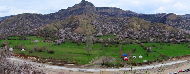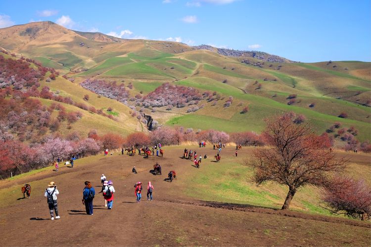 位于霍城縣大西溝福壽山的漫山遍野的杏花在碧綠色草地的襯托下婀娜多姿。