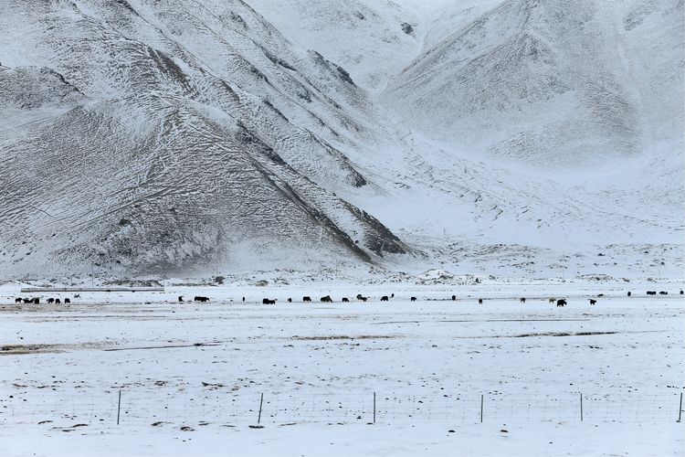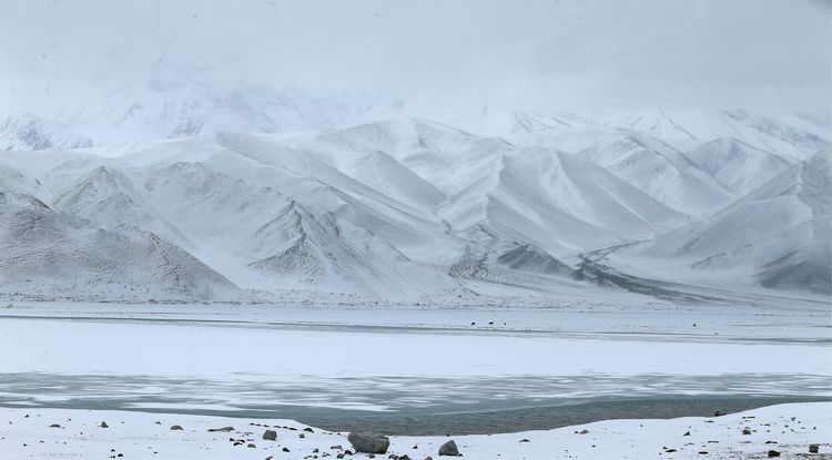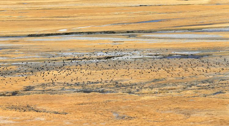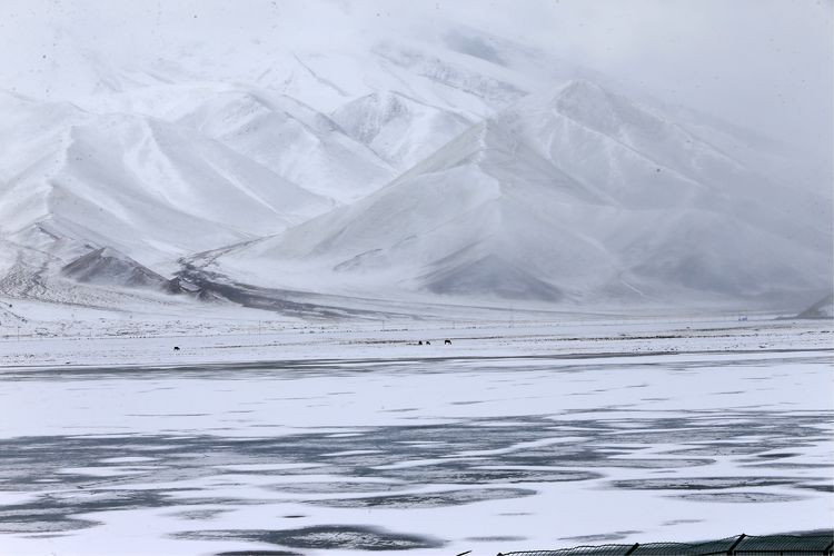 我們經過時,大部分湖面還被冰雪覆蓋,部分湖邊呈現(xiàn)出藍色的湖水,引來許多鳥類覓食。