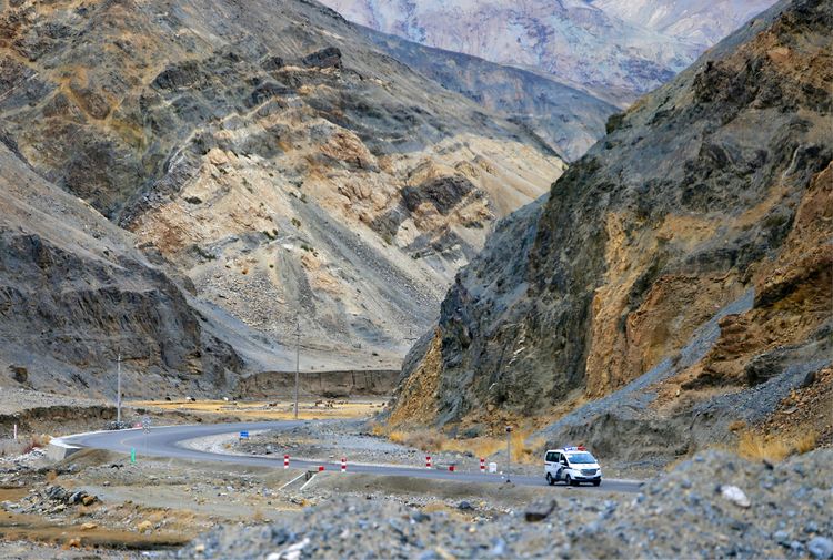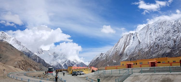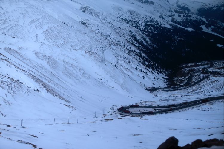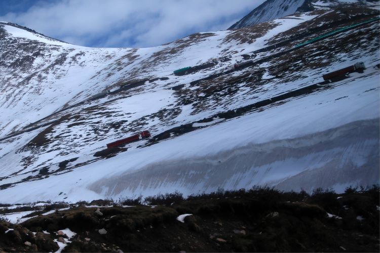 一輛輛大貨車艱難地行駛在盤旋公路上,公路層層相疊,汽車象小玩具一樣纏繞在山腰雪里云間,蔚為壯觀。