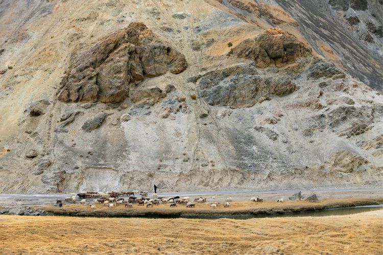 在本次的拍攝行程中,使我體會最深的一句攝影名言就是“好風景都在路上”。新疆這么遙遠廣闊,整天的行程基本上都是在車和飛機上渡過的,沿路風光變幻萬千,瞬間即逝。大巴雖是專車,但也不像自駕車那樣隨意停車拍照。這就靠在行駛的車中拍攝。好在新疆車輛限速很嚴,大巴一般限速在40-60公里之間。是車中隨拍變?yōu)榭赡?。隔著車窗雖使照片質量變差,但總比沒有強。況且拍的內容主要是村莊、人群、牛羊之類紀實照片,對畫質要求不像風光片那樣嚴。最好使用連拍速度較快的單反相機,快門速度放在500—1000分之一秒,始終拿在手中隨時拍攝。密切監(jiān)視前方隨時即將到來的素材,將相機對準與車窗玻璃呈90度角的地方,待素材闖入鏡頭的一瞬間按下快門。雖然這種拍攝成功率很低,但說不準也能拍到別人拍不到的鏡頭,回來通過整理所拍照片,發(fā)現(xiàn)挑選出來的有一部分就是靠這種抓拍的方式取得的。