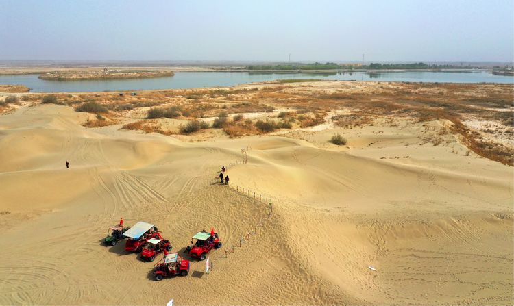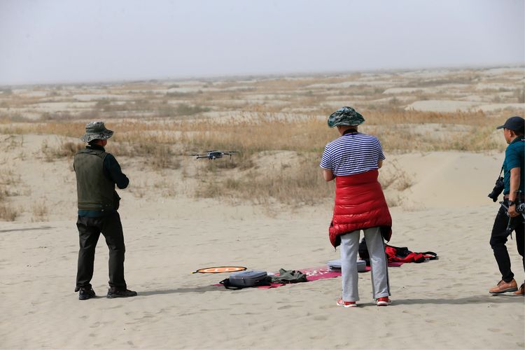 這次參加新疆采風的成員中有六位攜帶了無人機,一個個雄心勃勃,計劃在拍攝中大顯身手,以上帝的視角展現(xiàn)新疆絢麗的風光??墒牵捎谂臄z路線多在邊防區(qū)域,也或是景區(qū)怕發(fā)生炸機傷人事故,大多禁飛無人機。在廣袤無際的沙漠中,人煙稀少,游客無幾,景區(qū)內對無人機沒有限制,大家紛紛亮出無人機,盡情地飛翔吧。