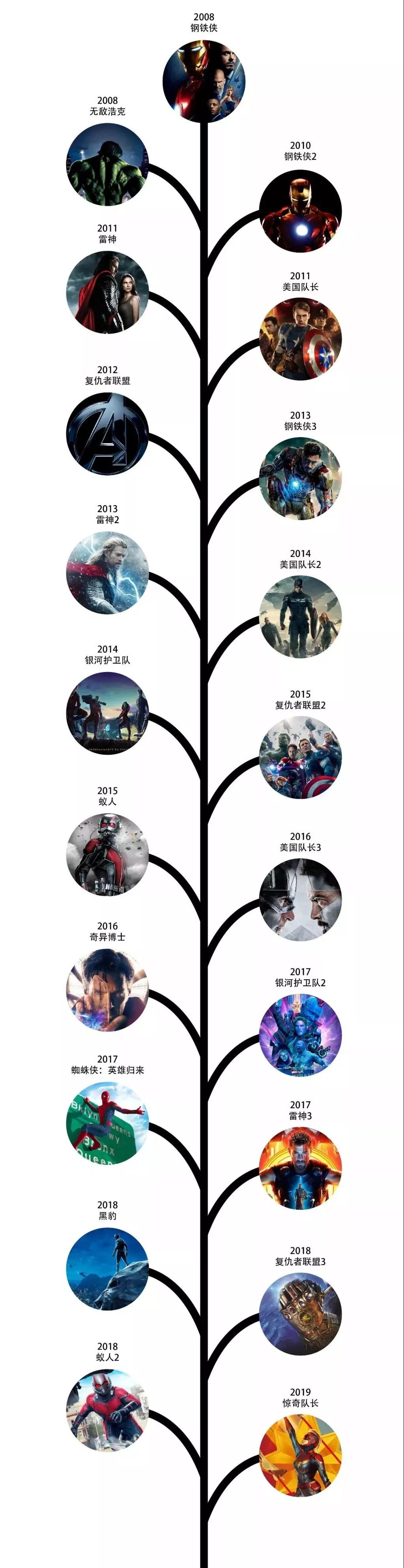 第三階段:從2016年開(kāi)始,到2019年結(jié)束:美國(guó)隊(duì)長(zhǎng)3、奇異博士、銀河護(hù)衛(wèi)隊(duì)2、蜘蛛俠、雷神3、黑豹、復(fù)仇者聯(lián)盟3、蟻人2、驚奇隊(duì)長(zhǎng)、復(fù)仇者聯(lián)盟4。