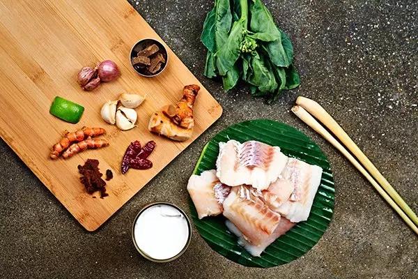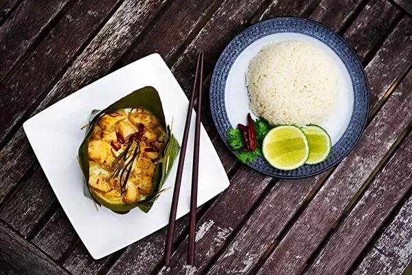 這道菜原本是古高棉人用來慶祝水節(jié)的美食,將肉類(魚、雞、豬、牛肉)裹在香蕉葉中烘烤,再加入椰汁、椰漿、高棉咖喱醬、檸檬葉和當?shù)厥卟耍献酪院蟛粌H顏值高,椰香魚香葉香渾然一體,口感綿密有點像咖喱。