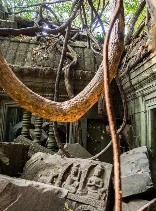 崩密列是吳哥窟公認最神秘的寺廟,崩密列的歷史還處于不明狀態(tài),據(jù)學者推測大約建造于 11 世紀末至 12 世紀初,宮崎駿電影《天空之城》的原型,古寺搭配樹木、青苔、落葉建構(gòu)出唯美的意象。整個寺廟嚴重崩塌,石頭落了一地沒有任何保護,感覺人人都可以撿走,被叢林層層覆蓋千年,各種被封死的的門,似乎里面隱藏著大秘密。