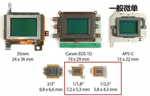 舉個(gè)例子,下圖中,紅色標(biāo)框的是手機(jī)的感光元件,上面的是相機(jī)的,相差還是很明顯的。