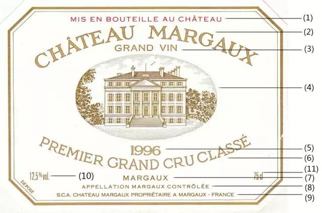 主要包含信息:(1)裝瓶地點(diǎn) (2)酒莊名稱 (3)優(yōu)質(zhì)葡萄酒 (4)酒標(biāo)圖案 (5)葡萄采摘年份 (6)酒莊等級 (7)子產(chǎn)區(qū)名 (8)原產(chǎn)地控制命名 (9)生產(chǎn)商 (10)酒精度 (11)容量