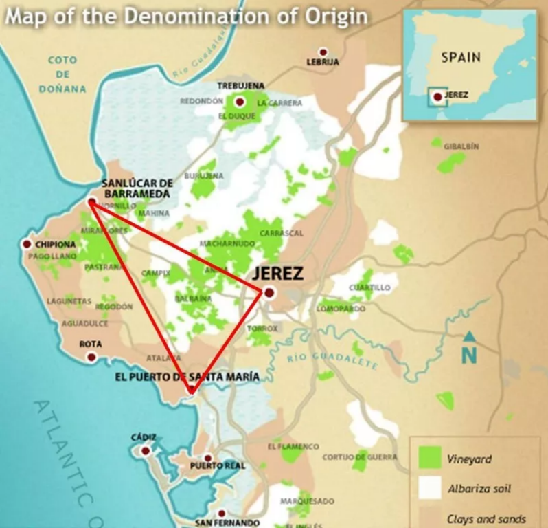 雪莉三角區(qū)位于西班牙西南部的安達盧西亞自治區(qū)。主要產(chǎn)地是赫雷斯(Jerez),再加上兩座海邊小城Sanlúcar de Barrameda和El Puerto de Santa María。全世界的“真”雪莉,只產(chǎn)自這三個地方。